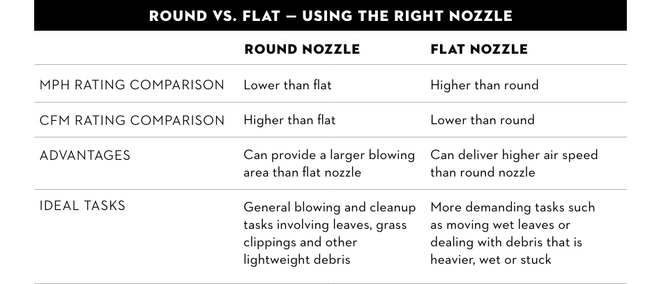 When the job demands higher air speed, flat nozzles are essential. Flat nozzles offer higher MPH ratings, which equates to stronger air speed. This makes flat nozzles ideal for situations where debris is heavier or stuck to an object or surface.