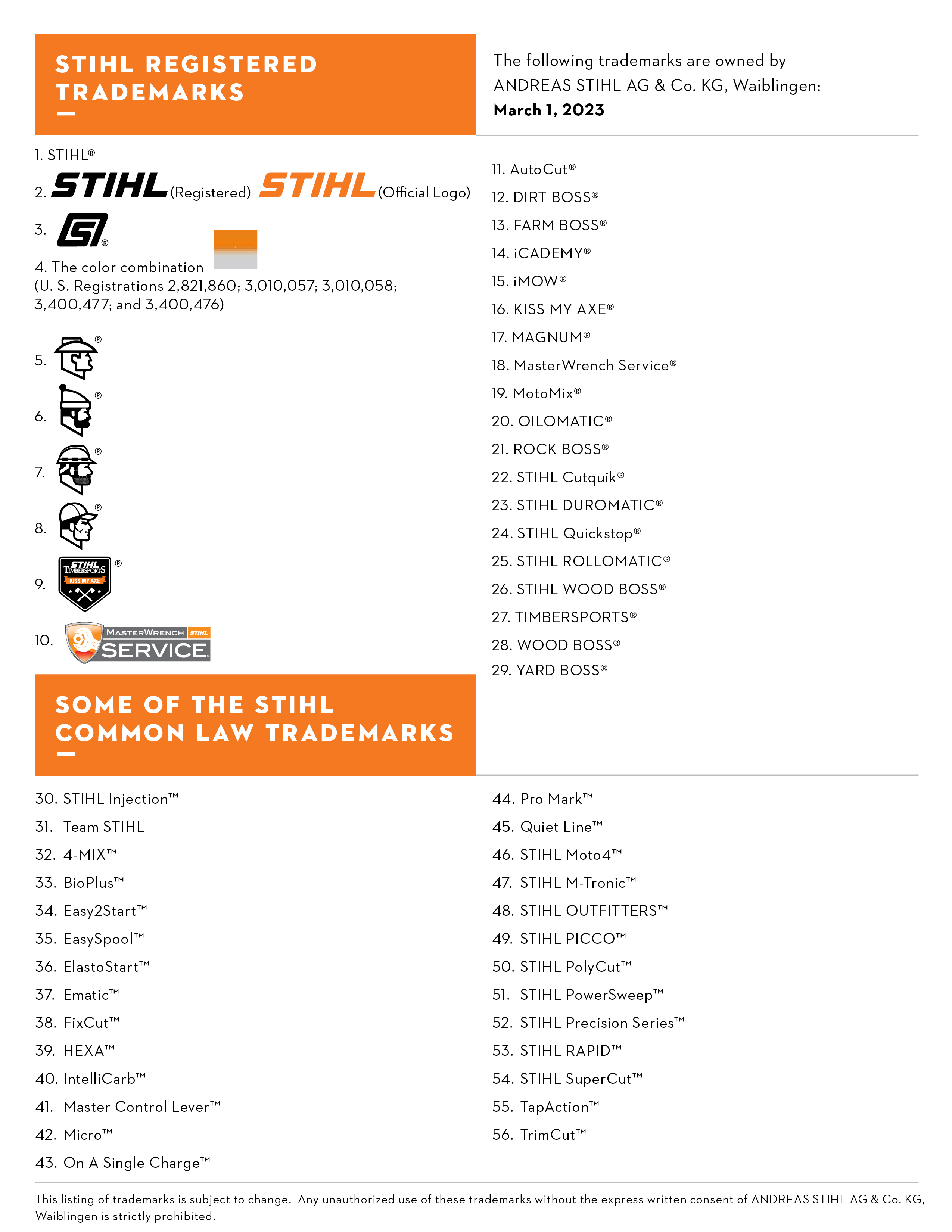 The names, marks and logos appearing in this website are, unless otherwise noted, trademarks owned by the STIHL founding company, Andreas Stihl AG & Co. KG, and used under license. Any use of these marks by You, except as provided in these Terms and Conditions, is prohibited. From time to time, STIHL makes fair use in this website of trademarks owned and used by its competitors. Any such marks are clearly noted, and STIHL makes no claim to ownership of those marks.