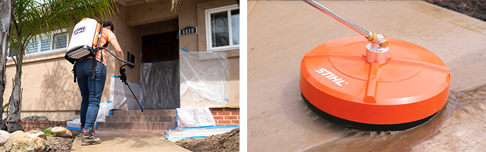 Before you apply stain, thoroughly clean the concrete using a hose or pressure washer with a rotary surface cleaner.