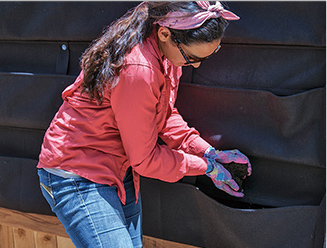 You can build a similar structure or create something unique of your own. We used three five-pocket units that hold about 2 cubic feet of soil and are 15 inches tall and 112 inches wide. You can customize your wall to the pocket sizes or buy individual pockets as needed to fit the space. Hang the bag by slipping the grommets onto the screws.