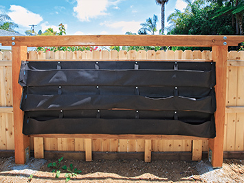 You can build a similar structure or create something unique of your own. We used three five-pocket units that hold about 2 cubic feet of soil and are 15 inches tall and 112 inches wide. You can customize your wall to the pocket sizes or buy individual pockets as needed to fit the space. Hang the bag by slipping the grommets onto the screws.