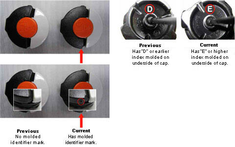 The toolless fuel caps subject to this recall can be distinguished from a newly designed cap which corrects this problem by a molded identifier mark located on the lever of the cap and also by a letter molded on the underside of the cap. These identifier markings are shown in the example photos below: