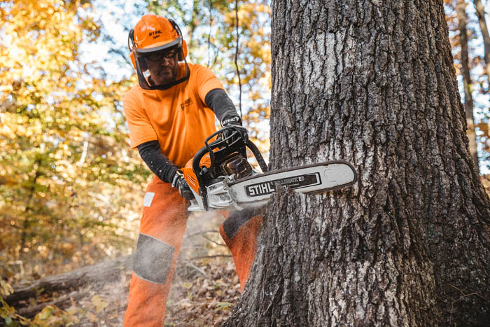 First STIHL chainsaw with electronically controlled fuel injection provides consistent power under changing conditions.