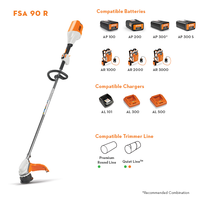 The FSA 90 R trimmer combines the benefits of Lithium-Ion technology with the renowned power of STIHL. A quiet, battery-powered trimmer, the FSA 90 R is great for landscaping in noise-sensitive areas like school grounds, business districts, or hospitals. If it’s ease of use you’re looking for, this is the trimmer you need. It’s lightweight, has a 15” cutting width, ergonomic loop handle, a slim profile for easy handling and transport, and starts instantly with a squeeze of the trigger. Additional benefits include the innovative control handle with ECOSPEED “soft” stop trigger setting, which can extend the amount of work done on a single charge. The time for trimming fuel costs and exhaust emissions is now, and the FSA 90 R is the right tool for the job.