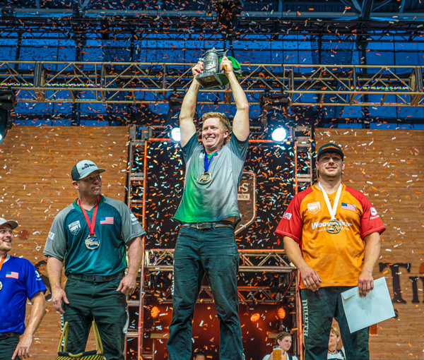 The Men’s Championship featured the top 20 lumberjack sports athletes in the country competing in six disciplines – the underhand chop, standing block chop, stock saw, singlebuck, springboard chop and hot saw. The 20 athletes competed in pool qualifiers the night before the final, and the top five from each pool advanced to the Championship.
