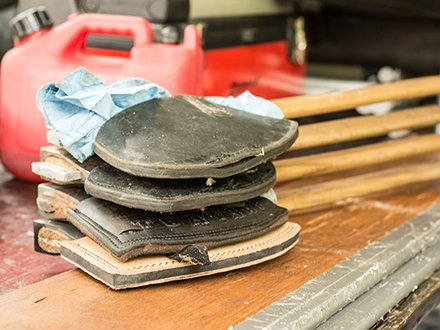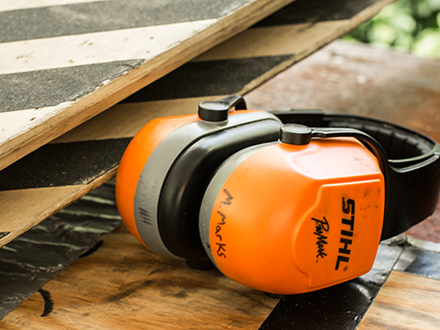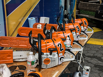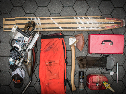 In an average day of competition, a lumberjack will need several different tools and equipment, such as razor-sharp racing axes suited to the wood species of the day, a pair of springboards, a six-foot long single buck saw filed for white pine, a STIHL MS 661 stock chainsaw, and an open modified hot saw (which is basically a 250cc to 350cc dirt bike engine with a bar and chain strapped to the crank shaft). Adding safety into the mix means a lumberjack will also have chainmail socks, flat soled shoes, chainsaw chaps, and eye and ear protection of their choice. When he is working in the woods, the lumberjack carries a lighter quiver. A razor sharp racing axe is replaced with a smaller axe to drive wedges or trim branches. There is still a STIHL chainsaw by his side, but no race-only hot saw. Good boots, chaps, eye protection, ear plugs and a helmet round out the kit and make sure our hard-working logger comes home safe.